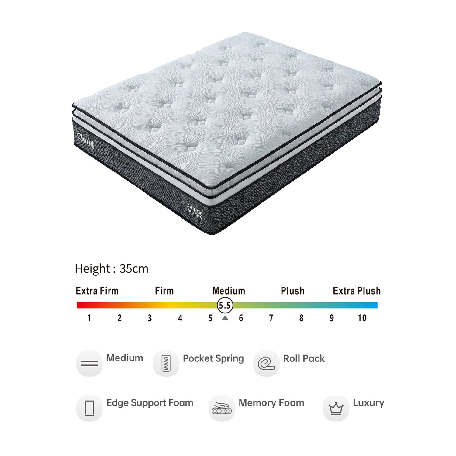 Overview: The Cloud Mattress features a sophisticated 13-layer construction designed for superior durability and comfort. At 35cm thick, this "Luxury" class mattress utilizes a hybrid design of foam and springs to deliver a Medium (5.5/10) feel.